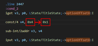 Located in the TitleState smali file is the optionOffsetX value set to 4. This value determines the movement of the options banner per frame. When it's equal 4, that means the options banner moves 4 pixels to the left per frame.