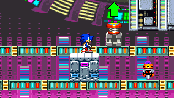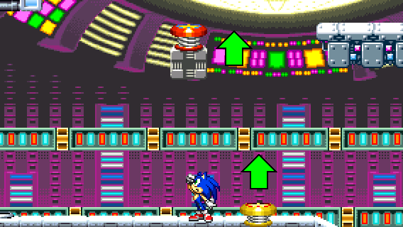 After traversing the dangerous obstacles, you will find a yellow spring and a red spring on a moving block above. Jump on those springs to go up.
